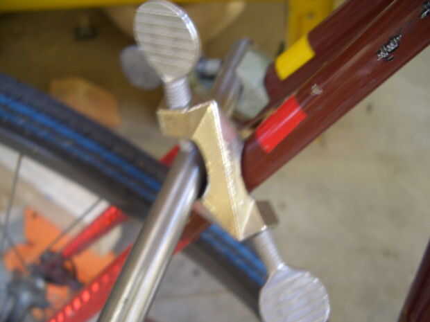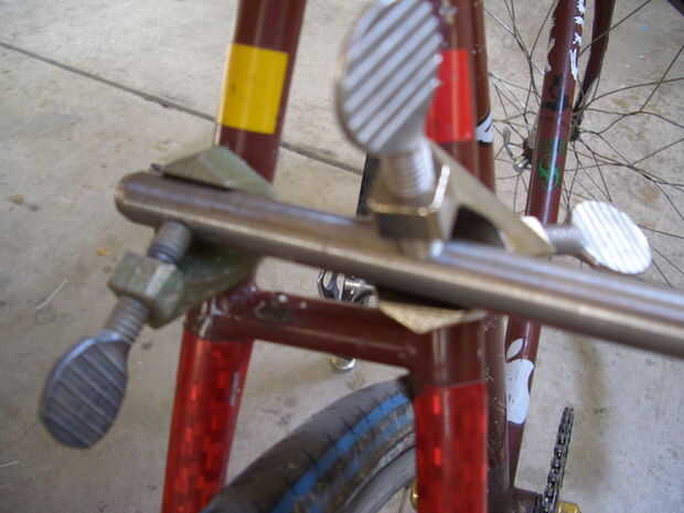 detalle de la conexión en la parte trasera se mantiene. conveniente grandes tornillos así que puedo tirar en y fuera de la bicicleta rápidamente.