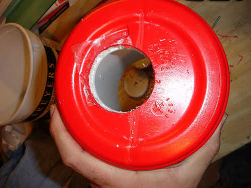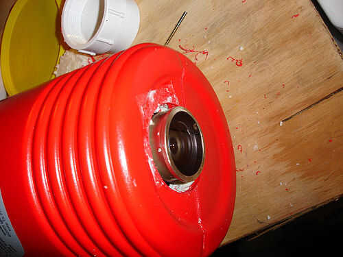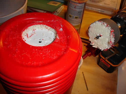 Cuidadosamente vuelva a marcar la parte inferior de la jarra, usé mi sierra (con el bit piloto) y perforó un agujero de 2 pulgadas. Usted necesitará sostener firmemente la jarra mientras hace esto y estar preparados para ir a través de dos capas de plástico con una capa de aislamiento entre ellos. No sólo la voluntad lo quiere jarra a la vuelta, pero como el agujero de Sierra de corte a través de las capas, causó mi taladro saltar un poco, que es por eso que estoy tomando nota de lo. Ten cuidado.