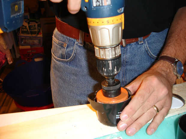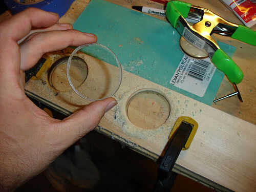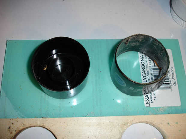 Entonces tomé mi Serrucho y la tapa de una vieja pintura del aerosol y (en un tablero diferente!) perforado a través de la tapa con el serrucho para cortar la parte superior. La tapa y mi agujero VI pasó a ser un ajuste perfecto, así que de nuevo tuve suerte. Utilizando la tapa de la pintura en aerosol para guiar el agujero vio, coloqué la tapa en Lexan, sostenido con una mano y utiliza el taladro y Sierra de agujero (sin la broca piloto) para cortar la lente de Lexan. Esto ocurrió hace un par de intentos, pero tenía un montón para jugar con. Si alguien tiene sugerencias sobre cómo hacer este paso de otra manera, por favor hágamelo saber!