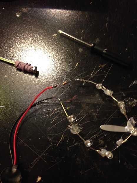 Que mina montado en el circuito de la serie, pero se puede hacer en paralelo. He utilizado la serie asi puede caber bien alrededor de la lente redondeada. Les tuerce las piernas montadas, luego soldar.