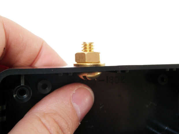 Pasar un perno de 1/4-20 x 1/2" desde el interior de la caja de salida. Fije en su lugar con una arandela y una tuerca.