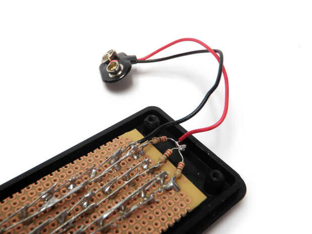Conecte los otros extremos de las resistencias en un solo punto y les de la soldadura junto con el cable rojo de clip de la batería de 9V.