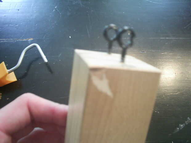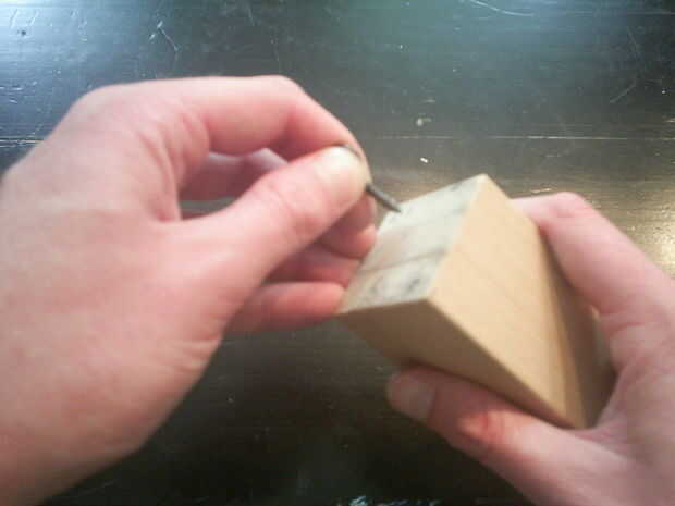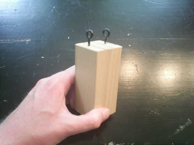 Tomar el taco de madera y atornillar los tornillos de anillo en la parte superior del bloque. Tenga en cuenta que estos anillos necesitan ser allined exactamente en el centro del bloque, de lo contrario que la cámara sería constandly hacia arriba, abajo, izquierda o derecha.