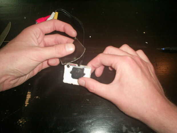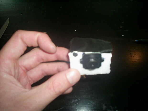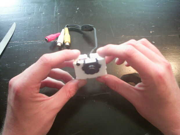 Tomar la toma de espuma de poliestireno con la cámara y cinta, o si lo prefiere, péguelo en la parte frontal del bloque. Te recomiendo la parte frontal superior, para que la cámara quede mirando hacia adelante. Tenga en cuenta que si usted decidir para colocar la cámara en la parte inferior del bloque está increesing el estabilizarse el movimiento dentro de la imagen como el bloque automáticamente.