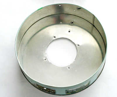 Coloque el recipiente en el centro de la lata de galletas. Marque todos los agujeros y taladro o nibble para quitar el metal. Utilice una lima para filos de sordo.