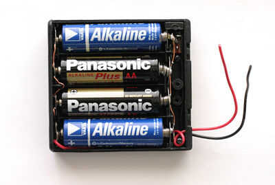 Vuelva a conectar la batería del AA por lo que las pilas están en paralelo, no en serie. Esto mantener la tensión de la misma (1,5 voltios) sino aumentar los amperios. Utilice unas pinzas de nariz de aguja, destornillador y una pistola de soldar para quitar el metal en contacto con las placas (primavera y pezones). Cortar las placas con unas tijeras y colocar todos los resortes a un lado de la batería y todos los pezones en el otro. Tomar un alambre desnudo y todas las placas de la entrerrosca de la soldadura juntos. Luego de la soldadura de todas las placas de la muelle junto con otro cable. Conecte el cable rojo a una placa de nibble y el cable negro al interruptor. El interruptor a su vez se conecta a una placa de resorte. Instalar las baterías y el voltaje de la prueba con un multímetro.