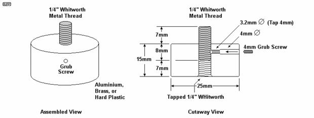 La forma más fácil de crear las secciones roscadas internas y externas es simplemente perfore el centro de aluminio (o latón o incluso plástico) y golpéelo suavemente a través de todo el camino. Una longitud corta de 1/4" roscado barra (corte de un tornillo de rosca metal) puede el ser atornillado en la 'tuerca' y asegurado con un tornillo sin cabeza o epoxi.