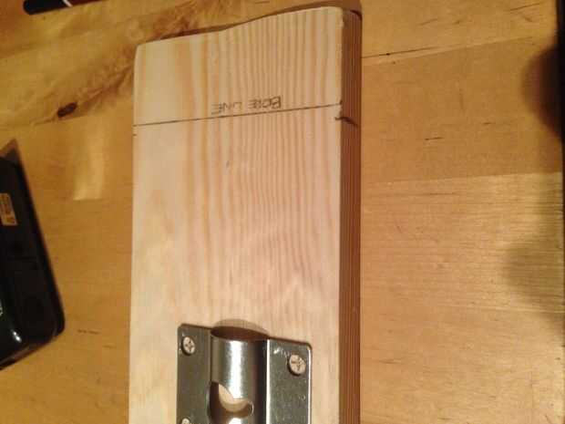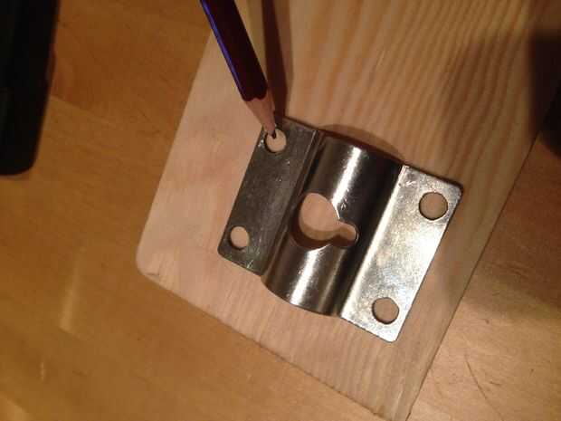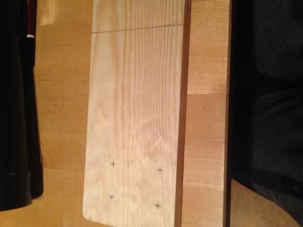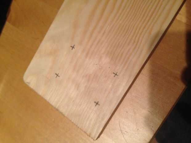 A continuación, utilizar uno de sus soportes; Marque los orificios en la pieza cortada de la madera con un lápiz - utilizará estas marcas para perforar los agujeros más adelante. Coloco mi soporte de 30mm desde el extremo de la madera pero, otra vez, esto no tiene que ser exactos tendremos un montón de ajustes más tarde.