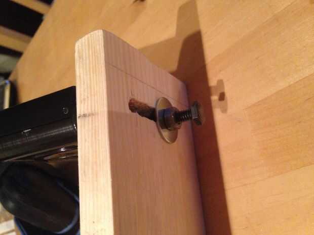 Ahora utilizando el perno largo de 1/4 pulgadas x 40 mm y una arandela grande; Levante el perno a través del fondo de la ranura aburrido y tornillo en la parte inferior de la cámara. Apriete ligeramente la cámara en el lugar.