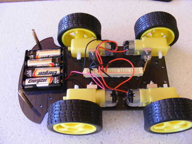 Pueden ser utilizados muchas bases diferentes, y esta es la parte menos importante de este Instructable. Se utilizó un chasis de robot motor DC 4, pero incluso podría convertir ese viejo coche R/C con un poco de hacking. Usted notará en la foto, hemos añadido una tabla de pan y una batería, una vez más (4) AA. Este chasis tenía rojo y negro cables, conectado todos los cables rojos en la izquierda de la Junta de pan y el negro en la derecha. Ahora aplique corriente y asegúrese de que todas las ruedas girar a la misma dirección. Tuvimos que invertir los cables de un motor, que como los otros. En Resumen, al completar este paso, usted tendrá un chasis que se mueve en una dirección cuando se enciende.