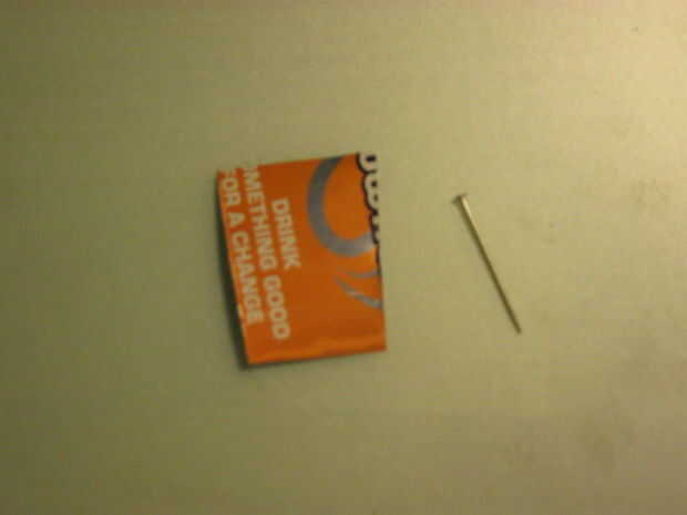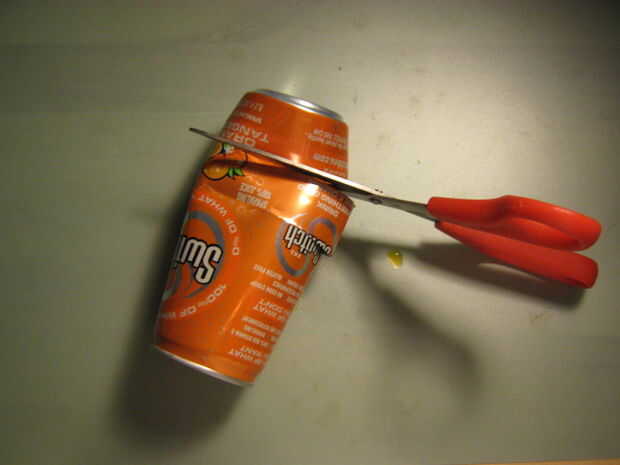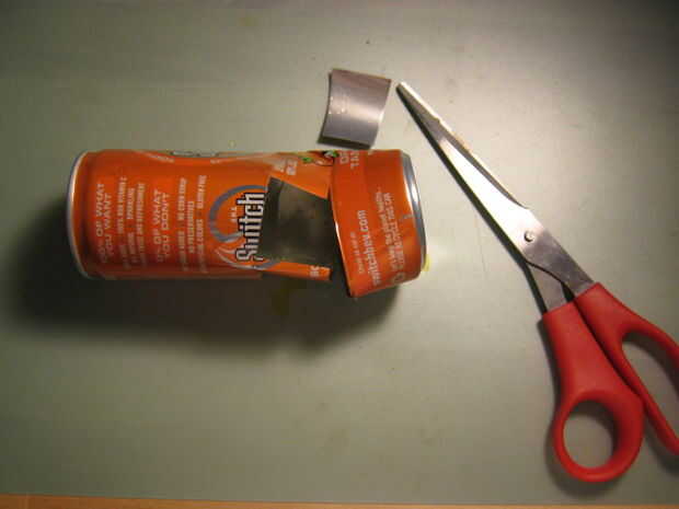 Corte un cuadrado pequeño de la soda puede (puede ser de cualquier dimensión, pero debe cubrir el agujero de 1/8 en la lata) y el centro de la plaza con la regla.