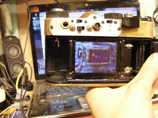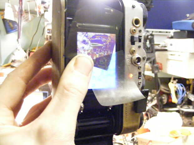 incluso tho la imagen es invertidas colores creo que voy a tener algo interesante con la película de la revocación del color. unos dobs de epoxi a lo largo de los bordes mantenga la cosa en su lugar, ahora mirando la pantalla en visión escarpada ángulos van de negro en vez de blanco, esperanza obtener mejores fotos, ha derecho