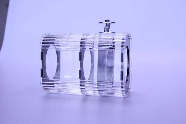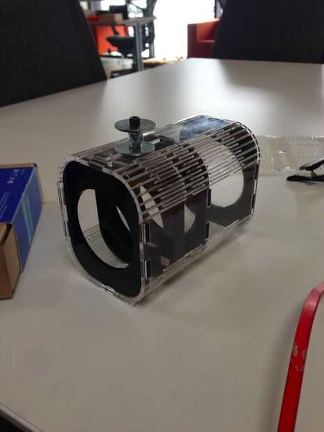 Me inspiré en dos otros artista en Prisca Visbol de residencia que trabajaba en lo que fue esencialmente moda de paquete plano. ¿Podrían diseñar este dispositivo para ser enviado en cantidades masivas, como IKEA, sin ocupar mucho espacio? Usando un cortador láser fue y exploraron esta idea. A través de un par de iteración la respuesta parece ser sobre todo sí, si no son responsables de la lente.