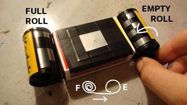 Para cada foto que tome, debe girar la película, para dejarla preparada para recibir otra foto. Haga una marca en el rollo vacío para ser capaz de controlar cuántas vueltas le está dando. También, marca el rollo vacío con una flecha, para recordar cuál es el vacío y hacia que lado tiene que girar (de lleno a vacío rodillo). Gire 1 ¼ para cada foto!