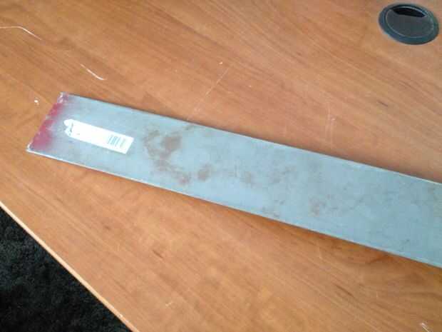 Pasar por su tienda local hard ware y recoger algunos acero. Esta pieza era aproximadamente de 3.5" de ancho y 24" de largo. Agarre una sierra, cortar por la mitad, doblar sobre su hombro y ahora el 75% hecho. YEP. Es el primer paso (o segundo).