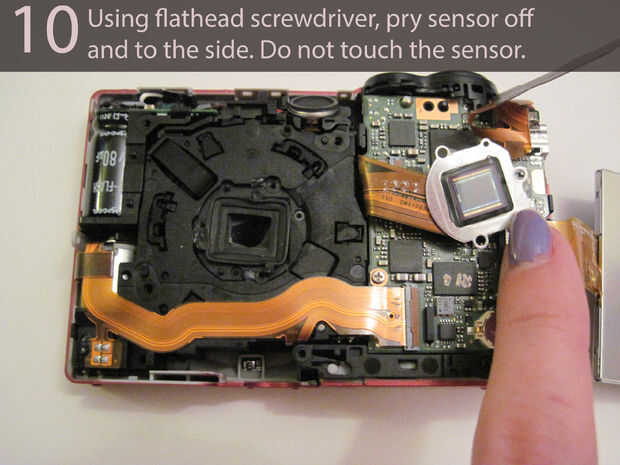 Trabajar el destornillador en el borde de la placa del sensor hasta que puede ser levantado y voltea a la derecha.
