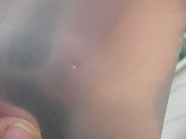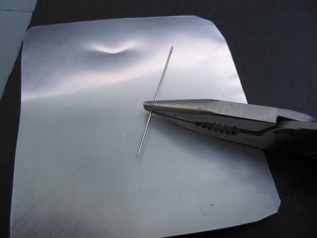 el truco para hacer un agujero muy pequeño es que el cuadrado de 2 x 2 de aluminio de una superficie firme y entonces use la aguja más pequeña se puede encontrar muy suavemente empuje el punto en el centro de los cuadrados de 2 pulgadas de aluminio pero no romper todavía, girar suavemente la Plaza alrededor así que el agujero es pequeño y circular.
