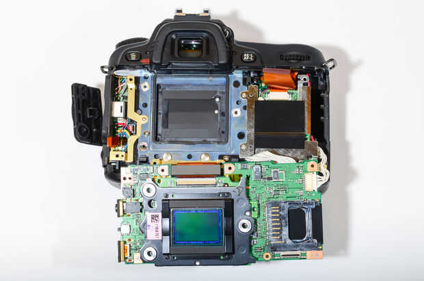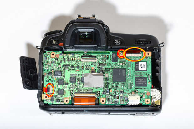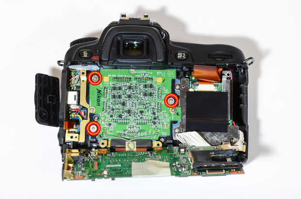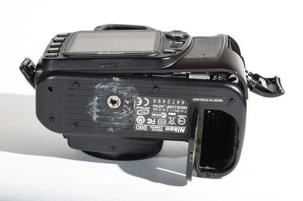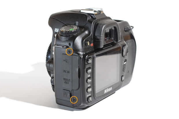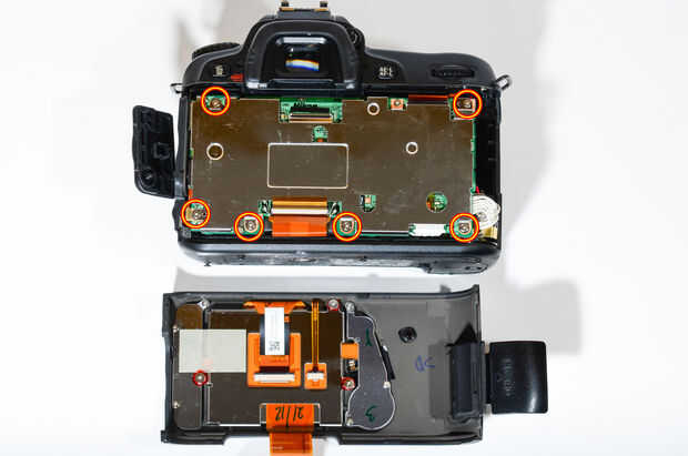 -Abrir la tapa y tire suavemente de la placa de fondo, mientras tanto abrir la puerta de la tarjeta CF y tire suavemente la parte trasera. Con un destornillador puede ayudar un poco a destrabar esa pequeña muesca en la parte trasera de la placa inferior.