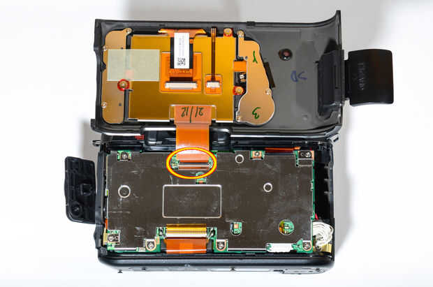 -Abrir ese pequeño bloqueo plástico para desconectar los cables planos entre el panel posterior y la cámara.