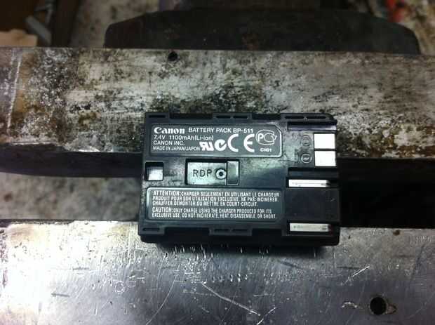 En primer lugar, Compruebe la batería para el voltaje que se imprime. La batería para una Canon 10d pone 7.4V (Foto 1). Un LM317 tiene una mínima deserción de 3V para que funcione cómodamente una fuente de alimentación de 12V para el voltaje necesario.