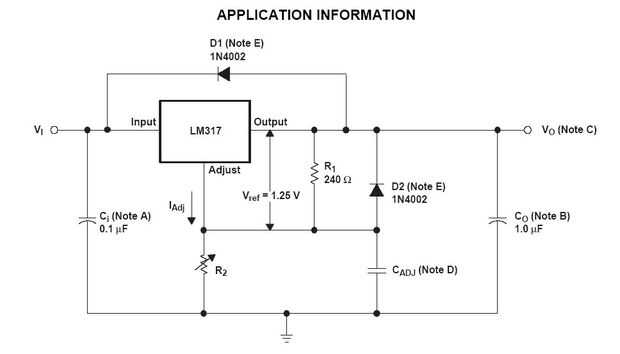Pongo el circuito usando sólo un resistor de 220 ohmios para R1 (hoja de datos dice 240) y un 5 k ajuste de R2. El pote de ajuste se ajusta según sea necesario para obtener la regulación de voltaje correcto.