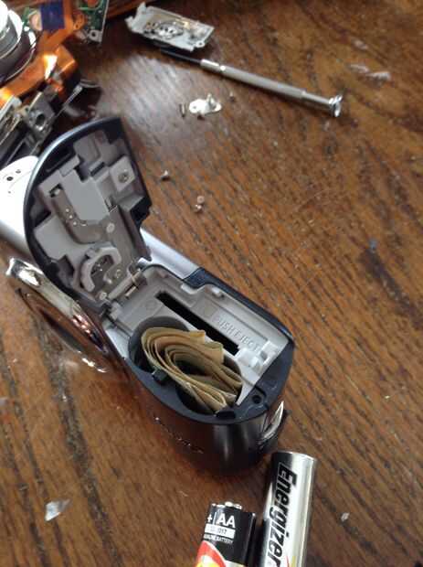 dos baterías de AA de la cámara, con el tiempo han desgastado el broche que mantuvo la puerta cerrada. entre otras cosas, he intentado hacer un broche de nuevo por el calor de la soldadura una tira de plástico de una tarjeta de identificación en la p