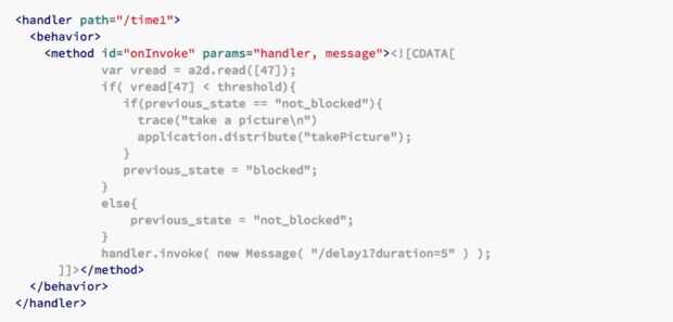Utilizamos un controlador para sondear la lectura de la tensión del pin 47. Cuando la tensión es mayor que el umbral, se llama al método "takePicture" para tomar una fotografía. Hemos implementado un bucle por el controlador "tiempo1" y el manejador de "delay1" llamando unos a otros.