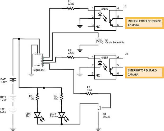 Los diferentes tiempos de espera como pulsacion de botones, inicializacion, encendido, apagado, deberan ser hallados de forma experimental pues pueden marco dependiendo del tipo de cámara usada. Patato uno de los interruptores funciona en modo "levantar" y el otro funciona en modo "tire" verificar bien esto con un multimetro para elaboró la forma de conexion de los optoacopladores.