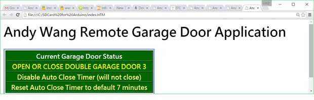 Tengo dos puertas de garaje a control. Este es el principal. Haga clic para abrir o cerrar. Requiere código de acceso de seguridad para habilitar el botón. Se necesita un servidor web externo que puede ejecutar los códigos php.
