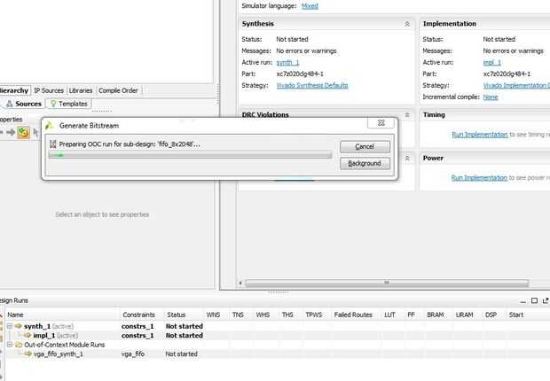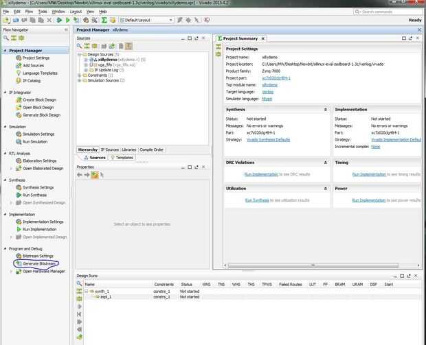Después de la inicialización del proyecto haga clic en Generar Bitstream (a la izquierda en el navegador de flujo -> programa y depuración) y esperar a que el proceso de acabado.
