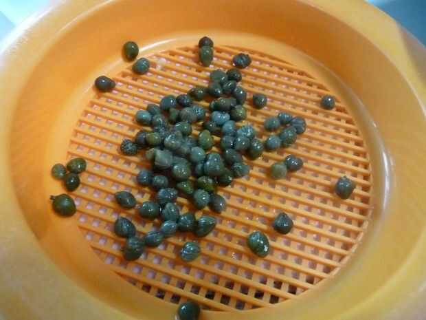 Enjuague las alcaparras en agua fría. Ponga a un lado.