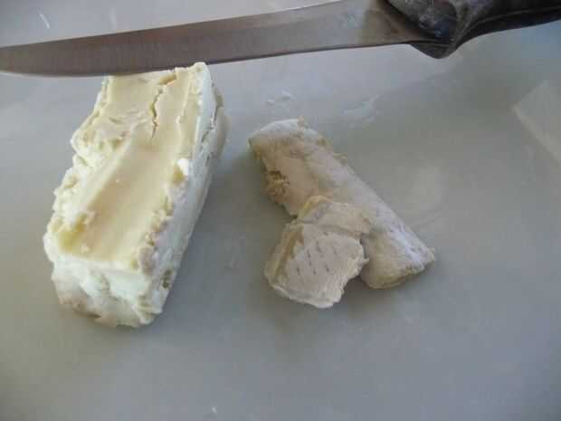 1 oz de queso Cambozola de la cuña de corte. Utilice un cuchillo afilado para quitar la corteza de los quesos Cambozola. Comer la cáscara. ;-)