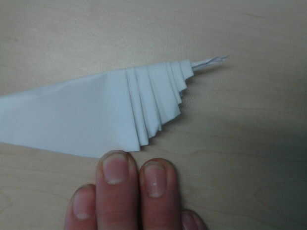 Hacer dobleces de montaña 8 y dejar algo de espacio para la cola. Después de haber completado esa tarea puede doblar los camarones por la mitad como se muestra en la figura 2. Ahora viene la diversión parte, lentamente tire cada pliegue de montaña que sigue siendo doblado pero lo rizos hacia arriba como un camarón real. A continuación, puede agregar color si quieres pero si no se realizan.