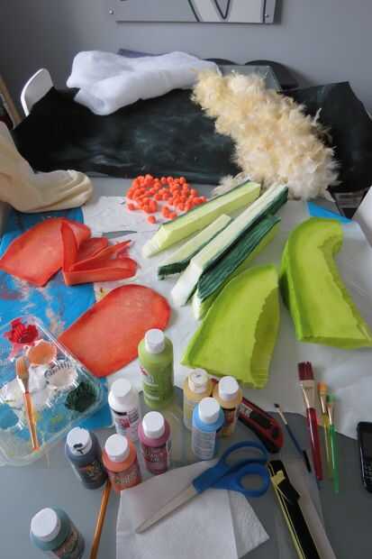 2. la corte desea piezas vegetales (en mi ejemplo, pepino y aguacate) con espuma de alta densidad. Basta con que sean un poco más de lo que se verá. Corté los extremos inferiores en gajos, para que la cabeza del bebé podría descansar cómodamente (como la etiqueta en la foto).