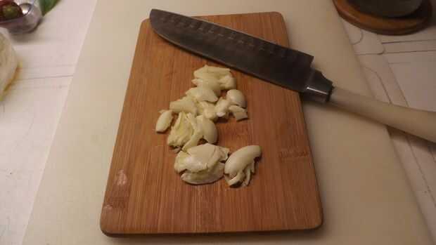 • * Nota: Al preparar el ajo, yo romper los dientes con la parte plana de un cuchillo o una cuchilla porque esto hace que sea fácil quitar la piel (cáscara). entonces yo cortar ese trozo marrón poco (el extremo del tallo) del diente de ajo y descartarlo (puede Agregar cierta amargura al ajo). Entonces finalmente picar o trocear el diente.