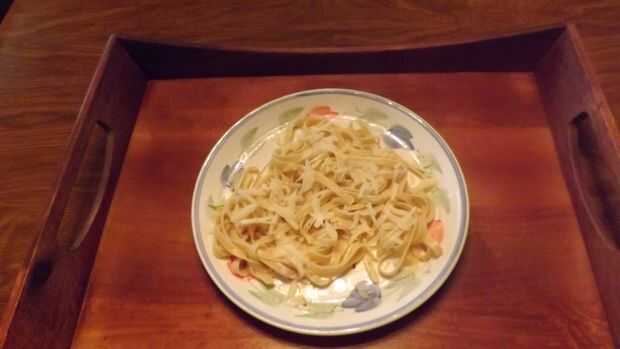 La pasta de la placa, repartidas que, con una gran cantidad de la salsa de camarones y almejas, un poco de queso rallado y esparcir algunas hojas de albahaca fresca picado sobre ella.