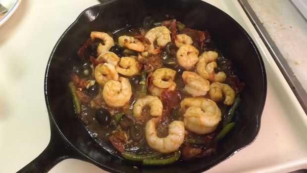 - Agregar el vino Marsala, aceitunas negras y ajo previamente cocido y cocinar a fuego lento la mezcla, convirtiendo los camarones de vez en cuando hasta que los camarones se cocinan a través (a sólo un minuto o dos, dependiendo del tamaño del camarón)