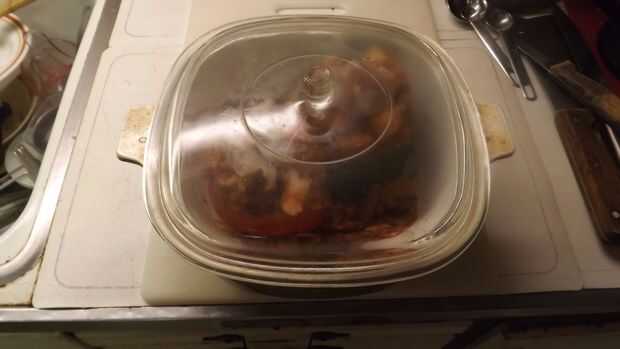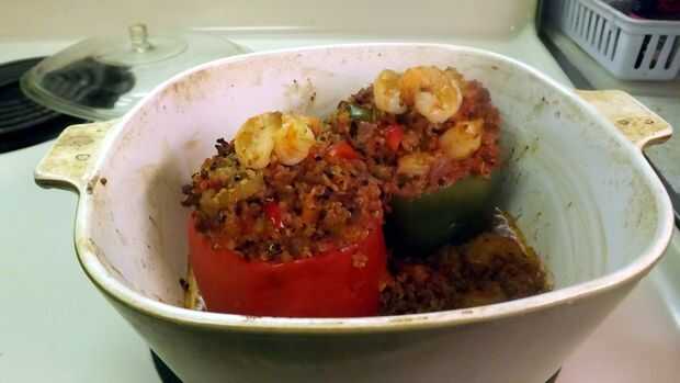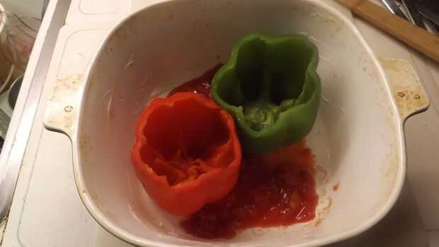 * Como se puede ver probablemente en la 1ª foto arriba, mis pimientos no eran del mismo tamaño (realmente no estaba pensando en hacer pimientos rellenos cuando los compré). El pimiento rojo fue un poco más pequeño que el verde, y tenía un poco demasiada mezcla de relleno. Deje que la mezcla de relleno sobrante caiga al fondo de la cazuela y resultó bien. De hecho, era tan sabrosa a extenderlo sobre la pimienta que yo comió para la cena