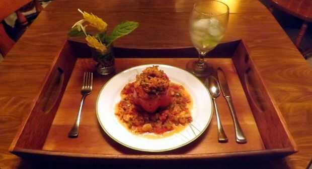 Quinoa y pimientos asado relleno de salchicha