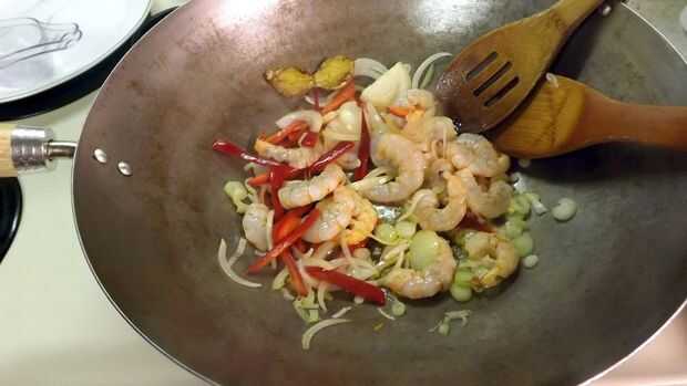CAMARONES salteados con cebolla y chiles rojos (3 / 5 paso)