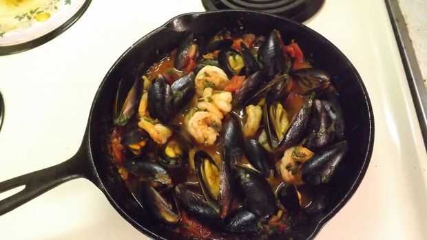 Después los camarones y mejillones se cuecen a fuego lento por cerca de 4 o 5 minutos, retire la tapa, añadir la albahaca picada y condimentar con sal y pimienta si es necesario.