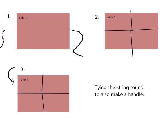 Para fijarlo, ponga la bolsa de piezas en el suelo, ponga la cuerda debajo de él con los extremos de la cuerda que sale de cada lado. Llevar sobre el frente y cruzar por lo que luego pasa a 90 º los otros bordes.