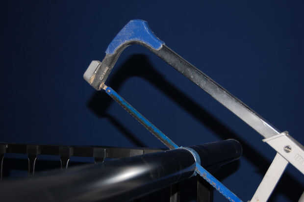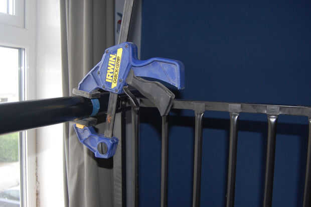 Después de determinar dónde quería cortar los postes me coloca la cinta y comenzó a hacer los cortes con la sierra. Después de los dos primeros cortes pensé que sería más seguro y más fácil si pongo la cama a su lado para no tener la litera superior de tironeo hacia abajo en mi corte. Una de las fotos muestra una abrazadera que sostiene dos cortan secciones juntos así que no tengo ninguna parte errante de cama estrellarse en a mis espinillas... seguro!