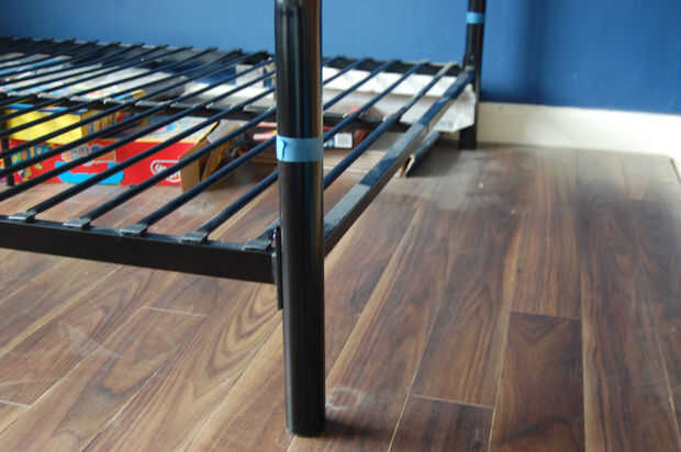 El primer paso fue separar la cama de dos camas. Después de tomar los colchones de las camas marcó el punto en que quería cortar los postes verticales con un cinta azul. La altura que quería los puestos finales que era una posición similar que es normalmente la parte superior del colchón.