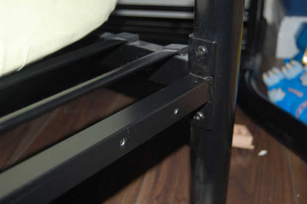 Una vez que la madera se corta taladro un par de agujeros en la madera para los pernos de carruaje, sujetar la madera al marco de la cama y marque los orificios en el bastidor con una broca de taladro. Quite la madera y la estructura metálica del taladro con brocas de aumentar de tamaño hasta que los orificios del tamaño correcto.