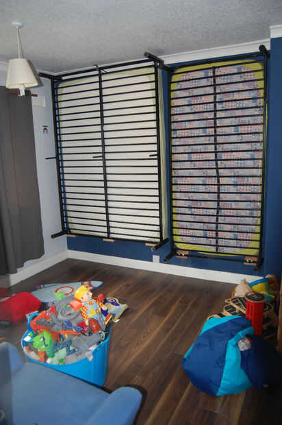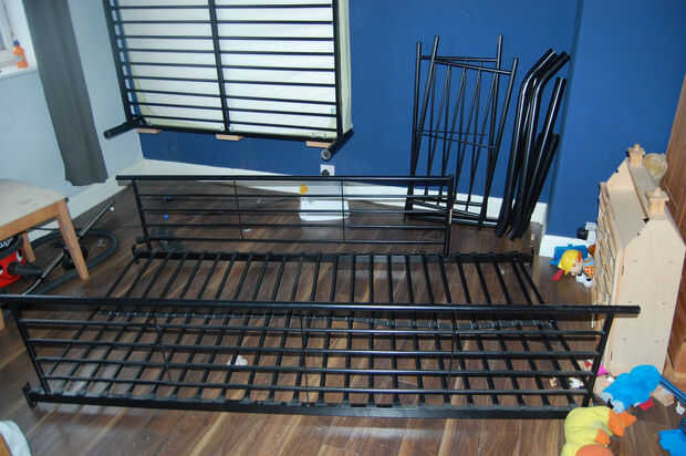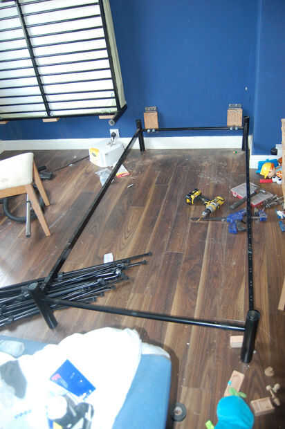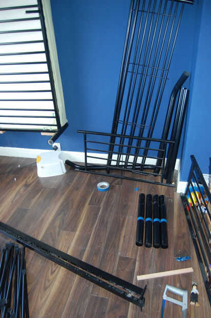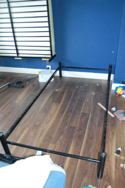 El marco externo de la cama fue hecho de secciones circulares atornilladas a otras secciones circulares a través de un agujero y como tal cuando se levanta la cama el somier gira así como las bisagras que no es realmente ideal y las piernas cavan la pared un poco. Voy a dejar esto para el momento de todas formas como no tengo pensado de una manera fácil alrededor de esto y no estoy planeando sobre el uso de estas camas todo el tiempo.