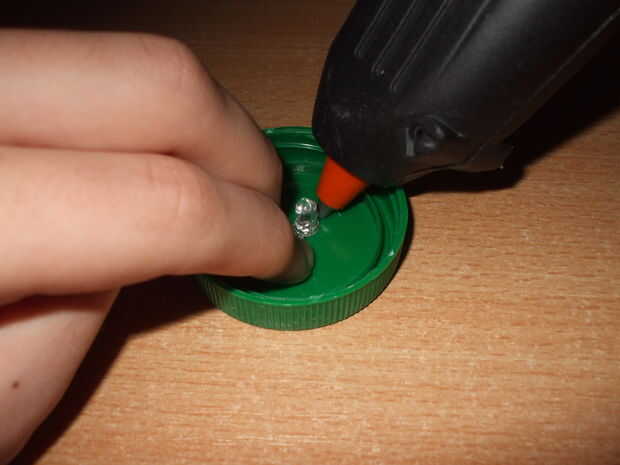 Después de preparar el cable, soldar los dos cables a los pines del LED y utilizar pegamento caliente para poner el LED en el centro de la tapa.