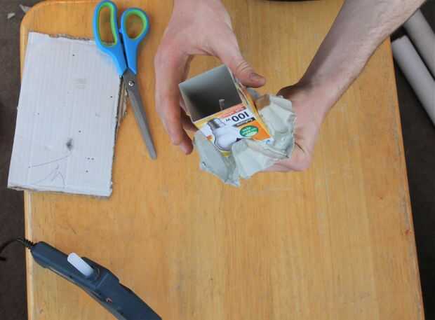 Unir el huevo y caja de cartón y sujetar con pegamento caliente.