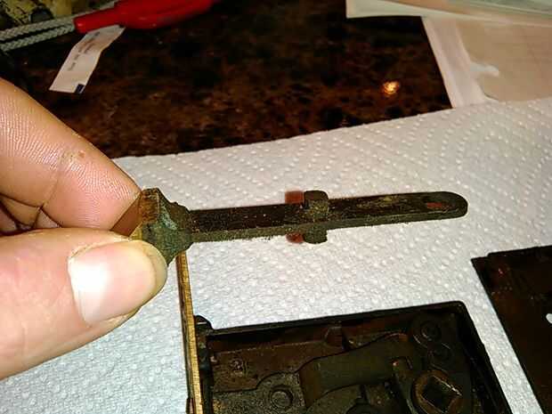 En este primer plano, puede ver el pin del brazo de resorte de cierre y el agujero en la parte trasera del pestillo para el perno de la leva del eje. La pieza es muy polvorienta, pero un cepillo de cerdas suaves hará trabajo rápido de eso.