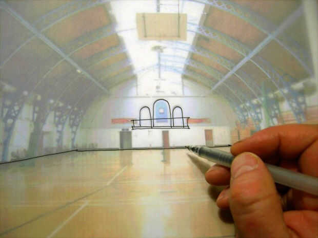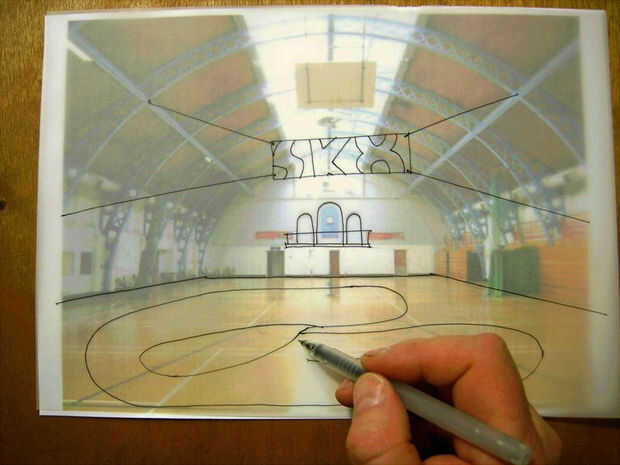 Comenzar a extraer su propuesta, también utilizando la pluma fina-en esta secuencia de imágenes de que he dibujado un nuevo balcón ver al final de la sala, el tazón de fuente del parque de skate ahuecada y una pancarta suspendida por encima.